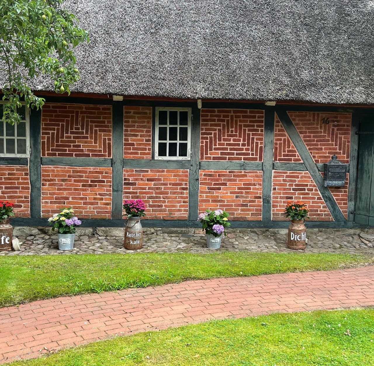 In der Diele wird, von der Schlachterei Hansen aus Bordesholm, noch geräuchert wie früher. Außen rum, in den alten Wohnräumen, befindet sich unser liebevoll eingerichtetes Café!